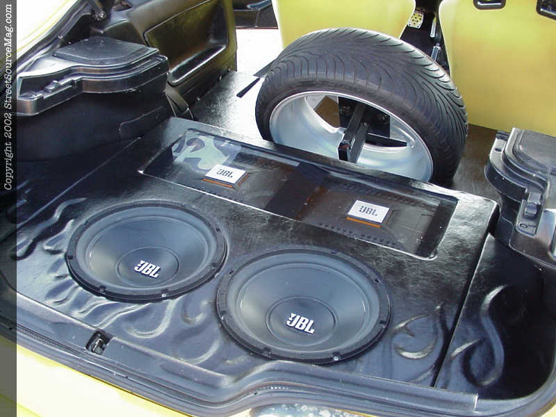 Starting with a Sony CDA760x in dash pushing sound to a set of Infinity 6 ½ in doors and JBL 6 ½'s in rear. To help keep up with the mids and highs, a pair of JBL GT12's would be installed. Keeping the current flowing through out would be a JBL 80.4 and JBL 600.1 amplifiers.   Not yet complete, the 6-inch Panasonic monitor in place of the rearview mirror would need some viewing. Bringing movies and what not to the screen would be the use of a VCR along with a Playstation 1 and 2.
