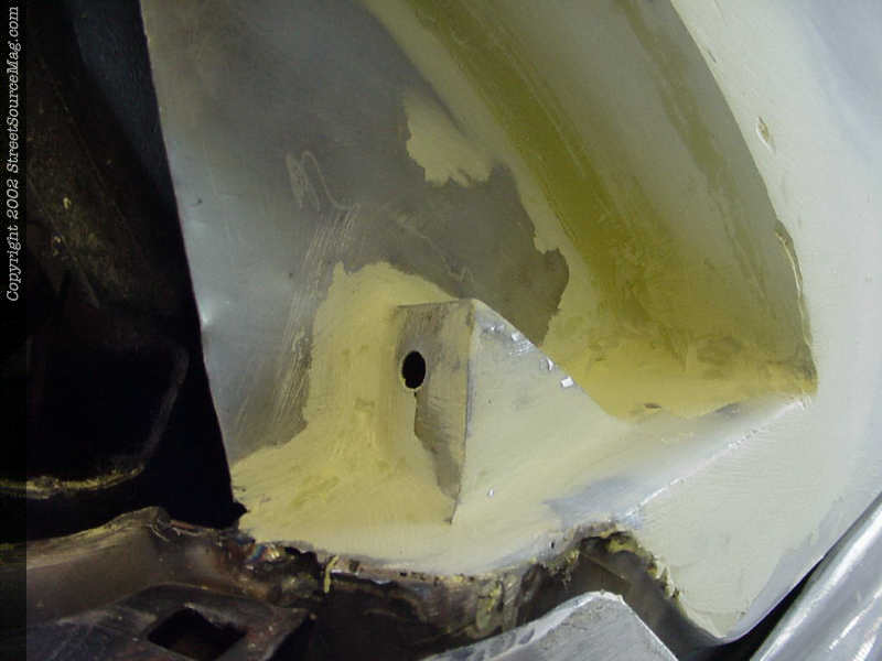 5. Once the new cups where in place, the welds are then ground down and then a thin coat of bondo was laid down and smoothed out to give things a more stock appearance. 6. With the cups built, a pod on the bottom was built for one of the pegs on the back side of the taillight to sit into keeping things into place.