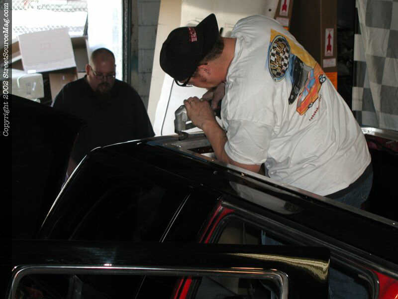 Not sure what was happening here, my eyes were shut! Actually, John had it under control. He is making the initial cut in the roof. Here, he is continuing with the initial hole in the roof. This is the view from the inside. After test fitting the frame, John trims a few areas for a nice snug fit.