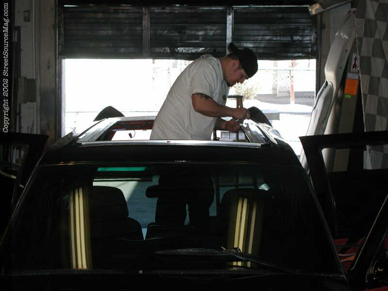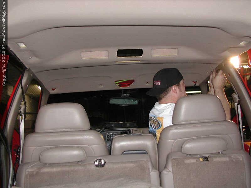 The frame is reinstalled and tightened down this time. Another inside view of the frame as it's reinstalled and tightened down. The headliner is then reinstalled loosely and the unused portion removed.