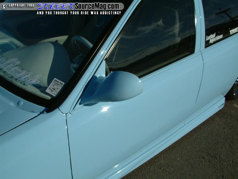 Next Sean would bring out the proper tools in order to shave the door handles, moldings, window squirters, and antenna, emblems and trunk lid. With a set of generation III projector headlights installed and Altezza style tails the transformation was almost complete. In order to finish off the exterior, Sean would have Rick Simmons of Salem, OR, prep the car and then lay down a smooth coat of Baby blue paint. Now Sean felt things were moving in the right direction.