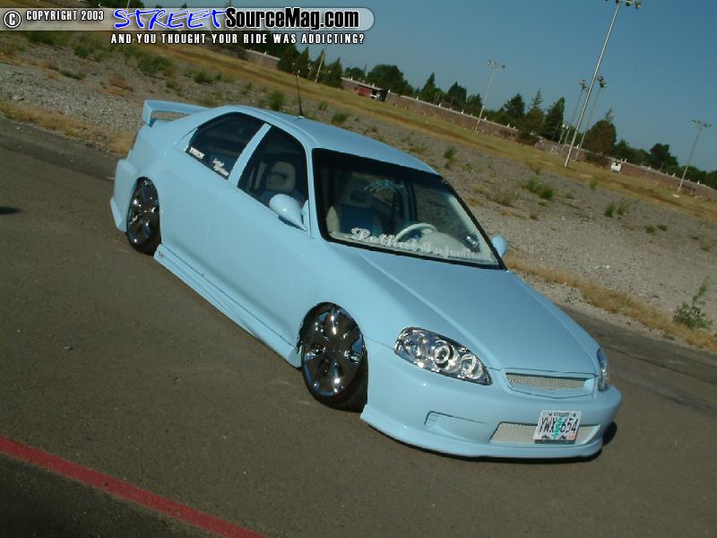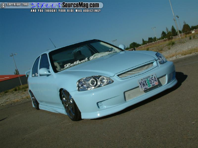 With his Grandpa at his side, Sean would begin working the exterior of his ride in hopes of gathering much respect in his hometown. First the stock front clip would be stripped and replaced with a set off of a 2000 Civic Si. With a little bit more flow a Grillecraft insert would be mounted up along with a Black Widow body kit to bring a more custom feel about.