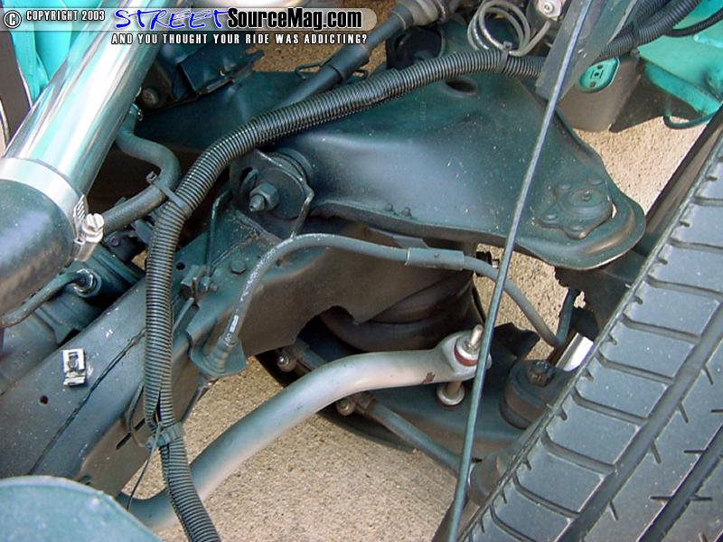 So the truck is looking good and sounding good, lets get into the suspension! To get the truck in this great stance that you see now, Mitch and his crew at Just For Trucks body dropped the truck 2 ½ inches. Lifting the truck comes from a complete Extensive Metal Works air ride kit. Up front Mitch installed 2600lbs bags and KYB shocks and belltech drop spindles to get the truck down on the pavement.