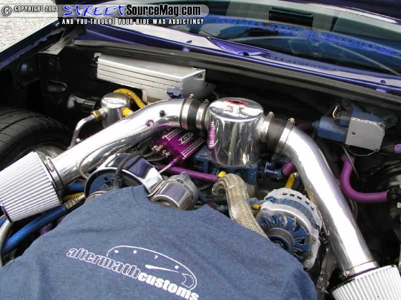 Now that the interior and exterior was in true Caddy style it was time to add some much needed power to the Cajun Caddy. Chevy really hit a high note when they introduced the 4.3 liter V-6. This motor has truly been a success story for Chevy but when installed in a fullsize truck it always seems to lack in the ponies department. Billy not being one to leave anything alone decided that the wore out V-6 needed a little freshening up.  So it was pulled and given an internal makeover. The block was line bored and then balanced and blueprinted to ensure reliability and dependability. While the block was tore down it was treated to the same color treatment as the exterior was. Next the heads were ported and polished and the valves were reworked with a 3 angle valve job to ensure proper seating. A Crane Compucam camshaft was then installed along with Crane 1.6 roller rocker. Accell was then called upon to supply the ignition system to supply the spark to the now built V-6. For induction a Holly Projection throttle body was installed to supply the much needed fuel and air to the V-6. Not wanting to take any chances of getting smoked at the track Billy decided that the ZEX 65 shot of the laughing gas was needed to help out. To get spent gasses away from the truck a Quickflow Exhaust system was then installed. Billy now had the combination needed to push the Caddy down the track, turning some low 15-second passes.