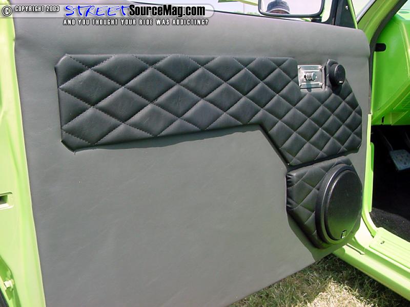antifreeze green kandy which was sprayed by Jim also. Now that the exterior was brought to life it was time to move on to the interior and spice it up a bit. On the interior Lonnie kept the theme of green rollin on to the inside, he pulled every piece of plastic he could and slapped it with the matching antifreeze green. Along with all this paint Lonnie built a custom console and door panels that Player Custom Interiors of Hockley, Texas wrapped in black and gray leather.