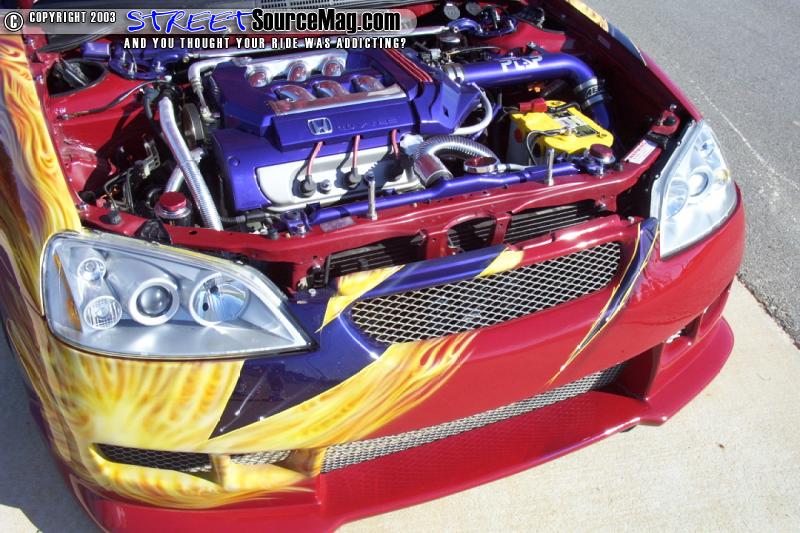 Turning his attention to the engine compartment Justin noticed it was lacking the same luster as the exterior and interior. So he polished the intake manifold, custom painted several items and then added an AEM cold air intake. To replace the nasty stock hoses, Cool Flex hoses were then added for coolant circulation functions. To ensure the proper fire power reached the motor a set of Magnecor plug wires were added. A Comptech header backed up by an all polished stainless steel 2 ½" exhaust with a polished cat and a pair of Greddy polished mufflers were added to ensure the Accord was not all show and no go.