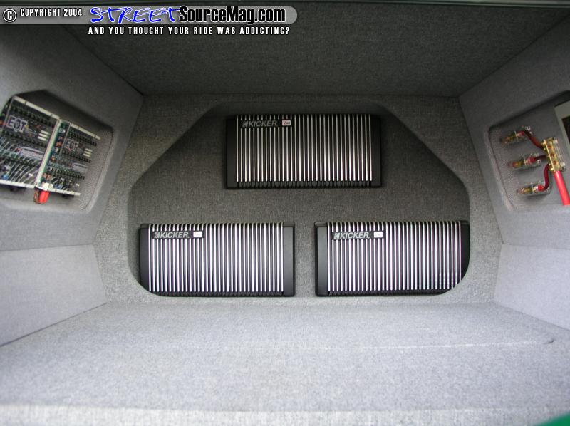 Now as I said before Jimmy is a bass head and loves car audio, so Kicker resolution separates were installed in custom built kick panels for highs. In the shell (6) Kicker SPL 12’s were added to a custom built enclosure that was also wrapped in gray tweed.