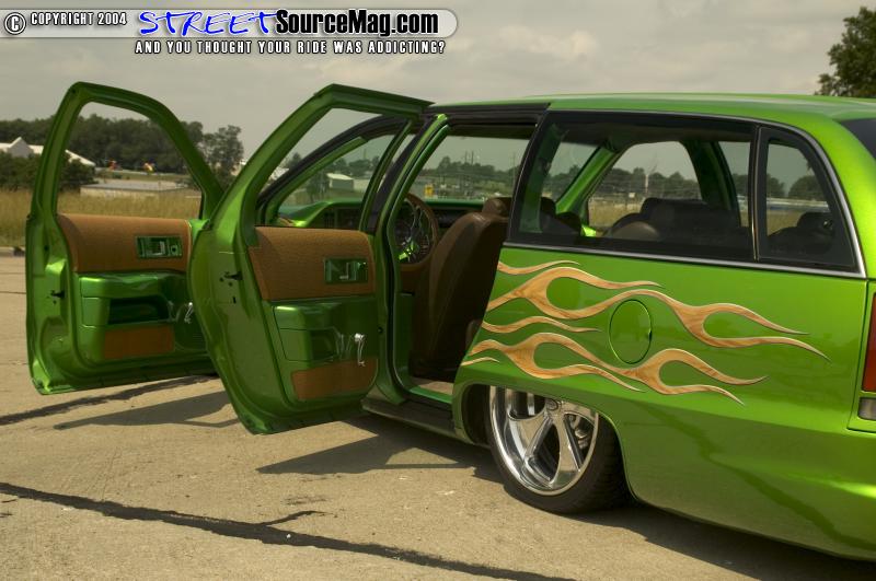 There is a Impalla SS grille shell with Trenz inserts added to complete the smooth looking front end. The glistening green you see is a House of Kolors Planet Green base topped with a Lime Gold Candy laid down by Tom Lubert of Florisant Missouri. Then the amazing claim to fame of the car, the wood grain paint, was put together and laid down by John, Aka, VanGough from Bauer Studios. If you have not seen this in person I highly suggest to check it out. It is simply phenomenal the detail that is in this grain! It has to be some of the best paintwork I have seen as far as realism goes.