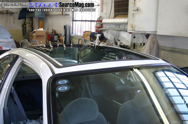 Since I work at a body shop that often uses silicon sealants we decided to use heavy-duty window and panel sealer used for sealing windows in cars and body panels. We spread a ½” thick bead around the area where the rag top frame is going to rest. Be prepared for a mess when you are doing this, I suggest you have some rags and lacquer thinner/cleaner close by. You will need a couple people to lift the ragtop into the hole. First make sure that the hole for the rag top lock is in the front. Lower the frame assembly into the hole and squeeze it tight to the roof being careful not to dent it. We used heavy duty C clamps to hold the frame tight to the roof, be careful not to make them to tight because you may dent the roof around the frame. We clamped the frame down on both sides and the front and back. We waited approx. 2 hours before we began any drilling. The silicon that is being squeezed out will take you a decent amount of time to clean up. After we were all cleaned up we cleared the silicon out of the holes so that the studs could be pushed through. Tighten the studs all around the roof by pushing the studs into the holes and using the washers and nuts from underneath. Be careful not to over tighten any of the studs. Next you can silicon around the inside of the studs if you feel the need to go the extra mile.