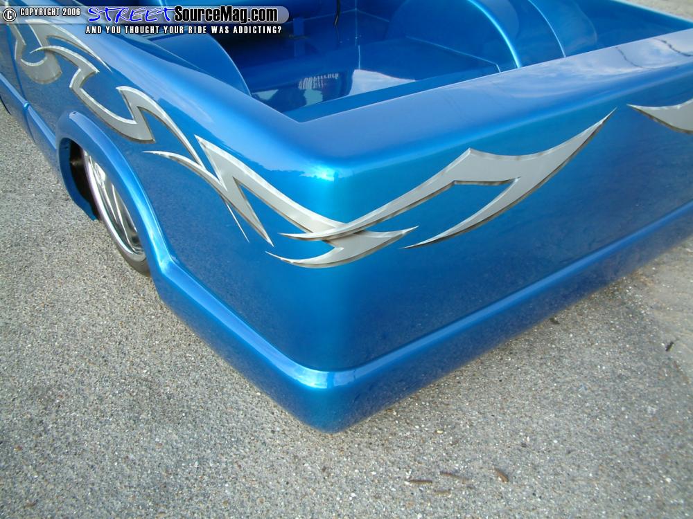 Working the front of his build first, Jason would bolt up a fiberglass hood with a 6-inch cowl. Next the stock bumpers would be ditched in favor of an ’02 Ford Ranger edge bumper fitted upfront along with a rollpan molded to the rear. The door handles would then be shaved along with the gas filler door, which would then be relocated into the bed.