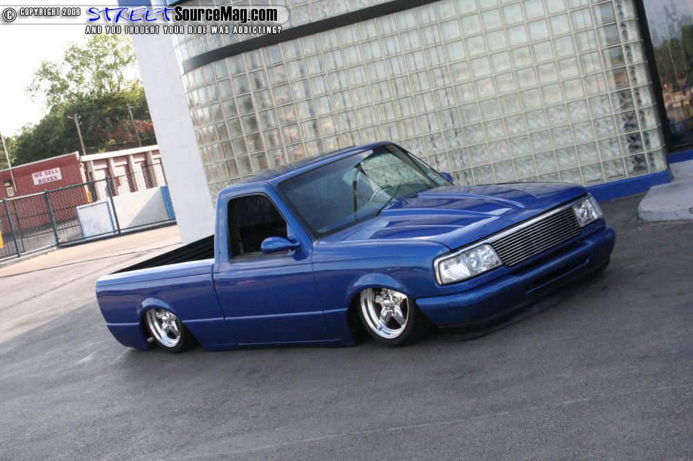 The factory hood was not going to work with the bodydrop so a cowl hood was bolted in its place and the stock hood became a piece of the past never to be seen again. Stock mirrors are for stock trucks, says Tyler so his were ditched in favor for M3 style units. The front end is not lacking the misuse of factory parts as the grille was swapped for a billet version, the headlights are now projector style and the corner lights are clear.
