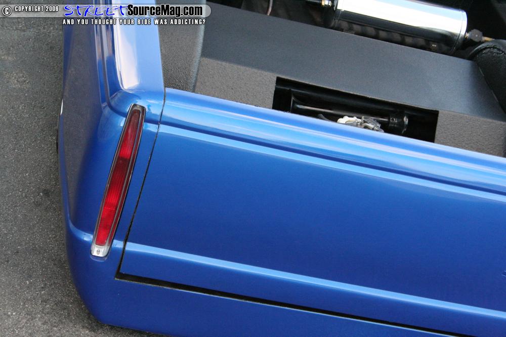 When the truck remerged it was heavily coated in the fine Sherwin Williams brand Electric Blue pearl. Underneath the attention grabbing paint you will not find Door handles, a tailgate handle, a gas filler door, stake pockets, and you will definitely not see an antenna. Also gone are the factory taillights, making a new home in their void are Cadillac tails with chrome bezels. Rear bumpers have no use when you do not tow a boat so a rollpan was thrown in to finish it off.
