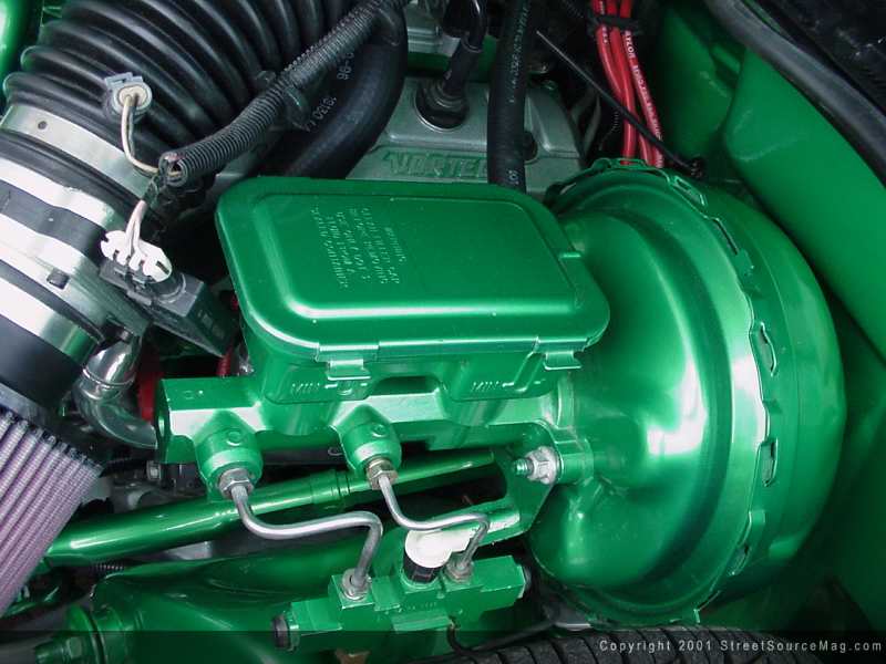 Next, the firewall was smoothed and painted. The factory 4.3 was cleaned and painted green and silver. In addition, Taylor plug wires, Edelbrock headers and a K&N filter was added. To bring it all together, a Flexalite dual 12 inch electric fan was added. To get the deep throat sound, Matt decided to go with a 3” Dynomax muffler and the exhaust was applied with a Ceramic finish. The engine wiring harness was also modified to clean up the engine.