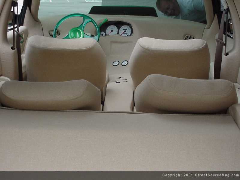 | To take care of the seating arrangements, Integra bucket seats where used front and rear and wrapped in sand tweed & vinyl. | Finally to complete this show stopper, the frame and engine compartment needed a little love. Matt started by pulling the 4.3 out and cleaning and smoothing the frame, then it was sprayed silver.