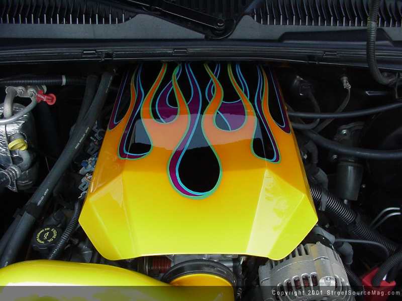 Last, but certainly not least, Pat’s 5.3 Vortec was treated to some customization of its own. Texas Motorsports created an aluminum air induction for Pat’s engine, and Pat himself added the flamed graphics. Dual Flowmasters and a Hypertech reprogrammer help squeeze a few more ponies out of Pat’s engine.