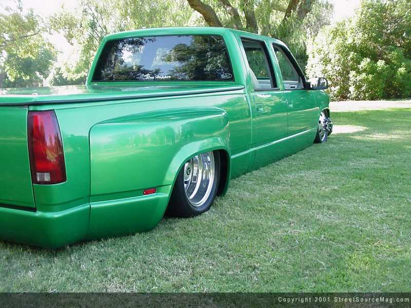 When Chad purchased his 1993 Dually back in 1996 his mind pondered on what could actually become of it. So, he called on Bobby McCurdy and Chris Daley of Totally Polished to start putting this 93’ Chevy on the ground. Bobby immediately began with the air bag setup starting with a two link and step notch in the rear that was custom built by Totally Polished. With the rear air bags taken care of they called on Pro Hopper for a front hydraulic setup. With the truck now laying frame Chad still didn’t think it was low enough, so after talking to Bobby McCurdy they decided to go with a three-and-a-half inch body drop.  | It just wouldn’t be right for the guys of Totally Polished NOT to lay the body on the ground. |