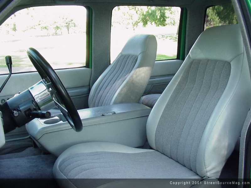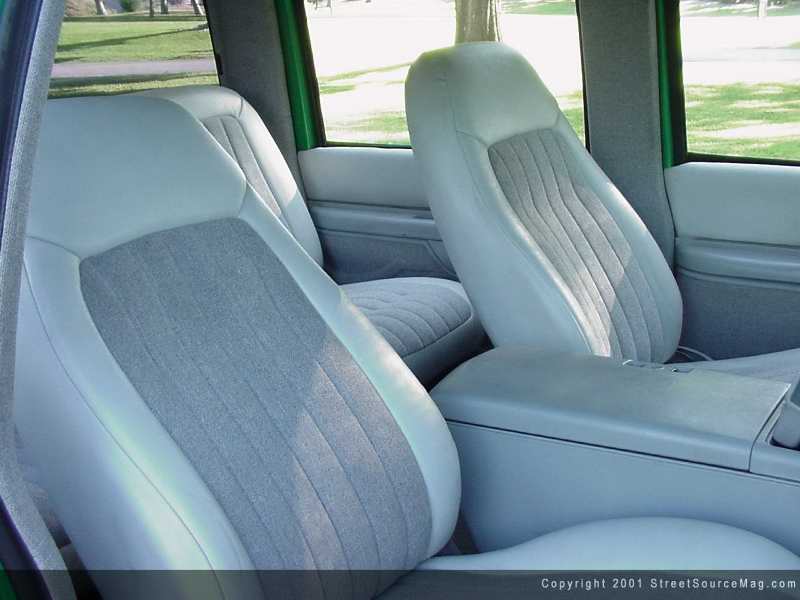 With all this said and done Chad decided to bolt on a set of sixteen-inch Alcoa Wheels with some 205/55 series tires. With the trucks paint and suspension now done Chad dropped it off with Mike Cox of Professional Autosound and Security in Westlake California. Mike began stripping the seats of their factory cloth and immediately doing everything up with light gray leather and tweed with tribal graphics incorporated throughout the whole cab.