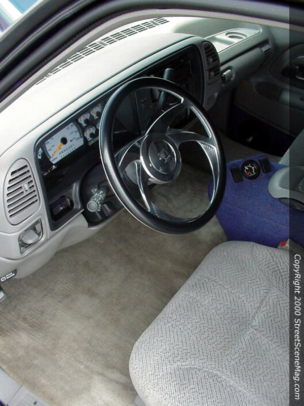 Inside Nelson’s dually, you will find a ton of items to compliment the work already performed. Nelson first contacted Godfather’s Customs for some bolt on goodies to accent the interior. Trenz billet dash inserts and door panels were put in place and APC white face gauges were also installed. A Billet Specialties GT53 steering wheel with carbon fiber ring was added as well.