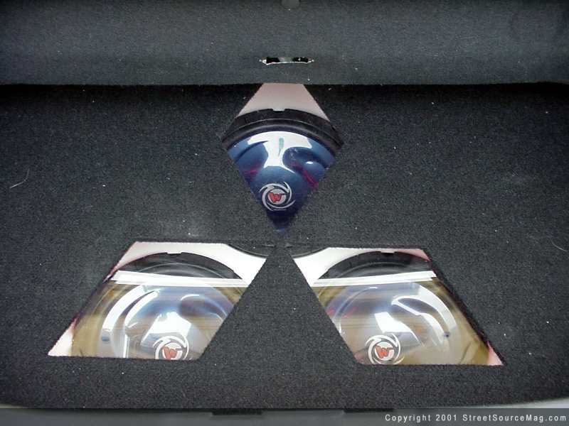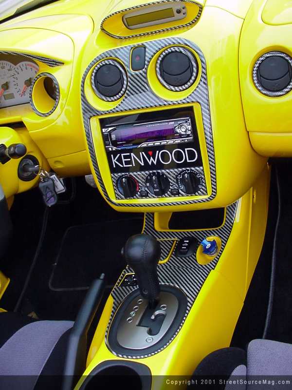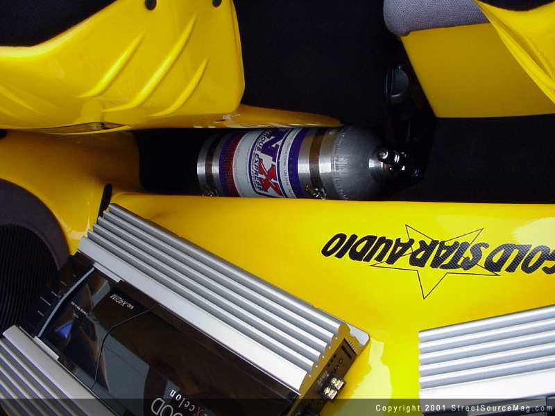 Kenwood high end and mid range speakers are installed around the interior along with a molded fiberglass custom sub box ported into the cab. Scosche EFX wires were used to bring the sound alive. The custom amp rack and subwoofer box was smoothed and color matched by Wet Works Garage. Roberts '01 Spyder was built to help promote Modern Image Sign Works and all the people and products that are on the car. The car was done in just 9 weeks of time to be debuted at the 2000 SEMA show in Las Vegas, Nevada. You can also see some of Robert and Modern Image's vinyl work in this summers hit movie "The Fast and the Furious"