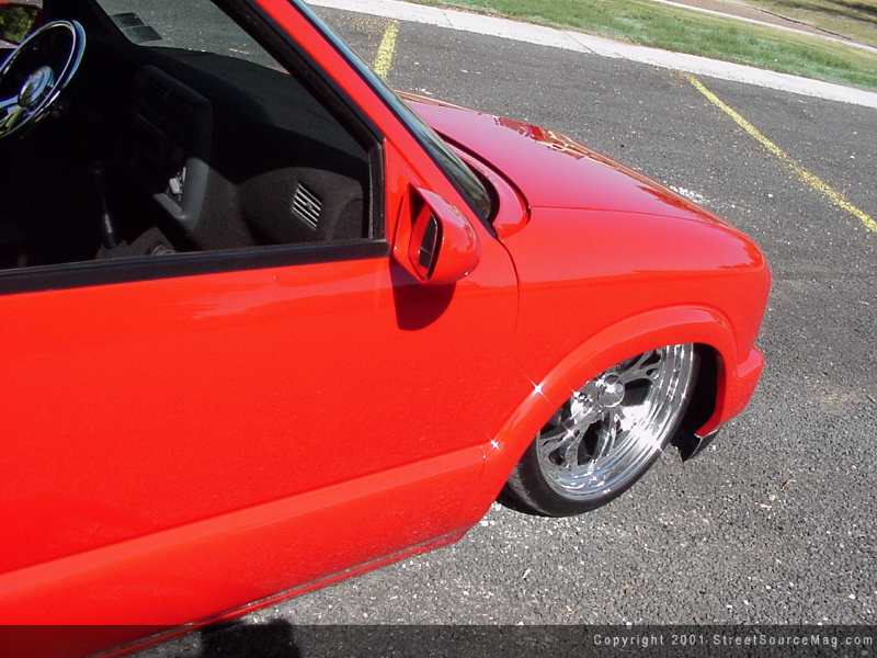 With the cab touched up, the front clip was all that awaited the customizing skills of Pats Auto. The front is where the unique modifications reside. With the custom grille with billet inserts bolted up, the front blinkers would be cut and molded into the grille shell itself with LEDs. Next the crew at Pats Auto molded the shortened 94 full-size Chevy front bumper to the fenders.
