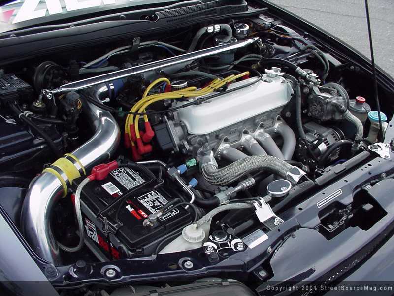 Under the hood, you'll find a very clean and tidy engine compartment, housing the stock 2.2 liter four cylinder. The valve cover has been powder coated as well as the strut tower brace and Reactive plug wires were installed to give the Honda better spark. Allowing the Honda to breathe a little nicer, Jason installed a custom dual exhaust system, using a DC Sports header, 2" exhaust pipe and Reactive muffler, giving the Honda a sports car tone. A Reactive air intake system lets the air enter the engine better, while a NOS 80 Shot Dry Fogger system boosts the Hondas power well over stock. Inside, you'll find a B&M short throw shift kit, which allows Jason to go through the gears quickly without missing a single beat. Jason's top speed to date in his clean Honda is 150 MPH.