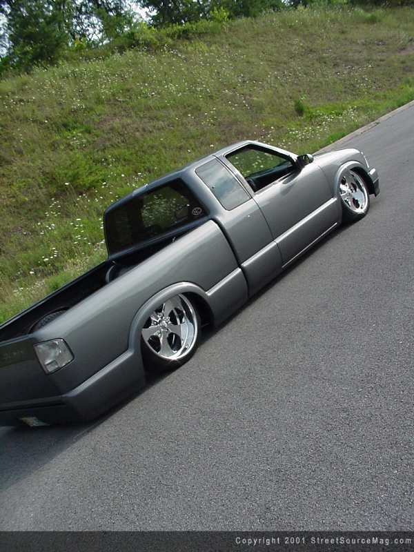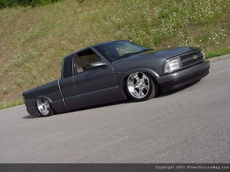 With the bodywork complete, Rick decided it was time to move to the suspension aspect of his S-10. Rick likes attention and the best way to get attention is to be low. You see, Rick's not scared to drag. He needed someone to help him get his S-10 to a ground-dragging stance. Adam Knape of Alvin, Texas stepped up to the plate to do just that. To get things started, Adam installed a set of Bell Tech 2" drop spindles, then installed a set of 3/8 ported Firestone 224c bags in the front to get enough lift to drive. Adam next notched the lower control arms, which allows the Doetech shocks to fit nicely in the front of Rick's S-10, still allowing full turning radius.