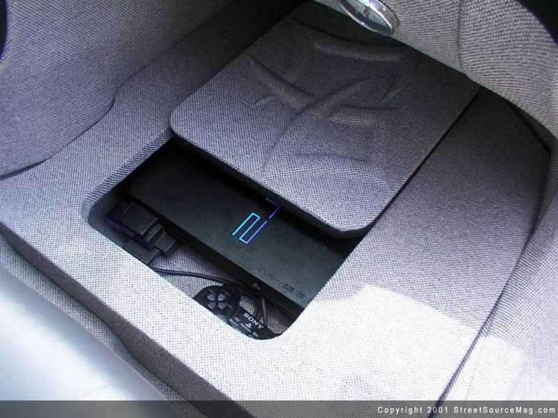 For driving enjoyment Scott has added a Clarion 6.4" TV to the passenger side rear view mirror, sunk a Sony Playstation 2 into the front passenger foot area and mounted a VCR in the truck. All of this is controlled by a Panasonic head unit.