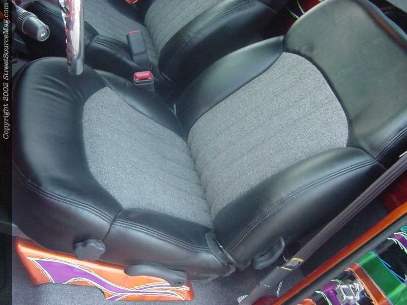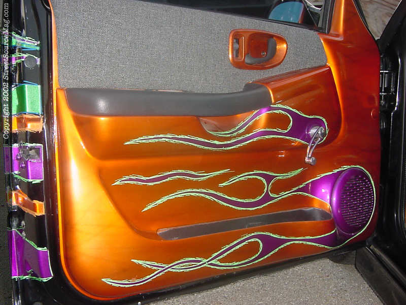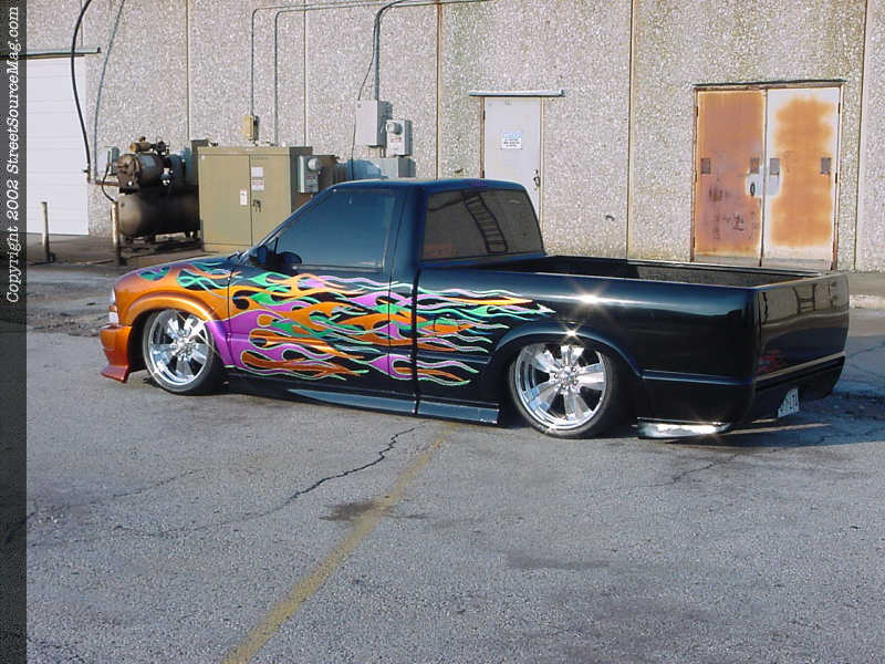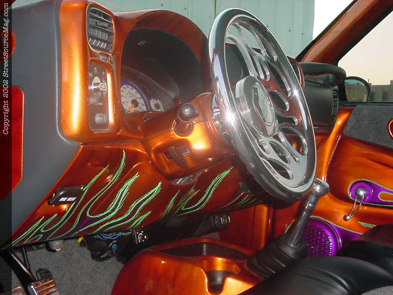 Cody showed the truck like this for a while taking home several trophies before he realized that to make a big impact he needed to be closer to mother earth. So it was back to Kevin at Kreative Colors to give the truck the more modern stance. Up front Kevin relocated the KYB shocks and replaced the springs for firestone 2500lbs airbags. Outback Kevin super notched the frame and junked the factory leaf springs and replaced them with a 2-link, a adjustable pan hard, a set of 2600lbs airbags and KYB shocks to dampen the ride. Now that the truck was sitting on the ground all Kevin needed to do is get it back up. Getting the truck up quick is not a problem when you are using ½ ASCO red hat valves, ½ lines and one big tank of nitrogen. Moving to the interior Cody kept the same concept as the outside by painting a lot of flames on the any thing plastic he could find and adding all of the billet pieces that was available for his Xtreme. For tunes Cody had Joe Mendoza wire up his Sony Xplode head unit, eclipse mids/highs, Orion 400 watt amp and his set of Fosgate 10" subwoofers.