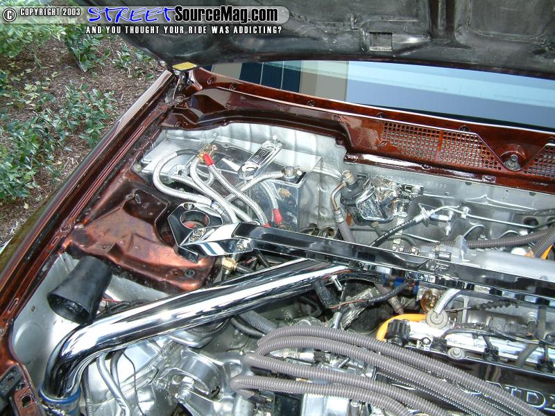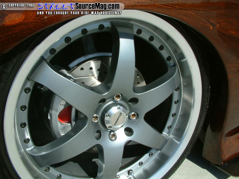 Finishing this true custom off, Kenny would need the suspension reworked. For starters Kenny would have a set of polished SMC cylinders installed at each corner along with ½ inch SMC valves for quick movement. Behind the 18-inch Tenzo R Mean 6 rims wrapped in an aggressive 215/35 Nankang tire, you can also see the detail of Chrome drums, Brembo Power Stop crossed drilled rotors along with an APR chromed sway bars.