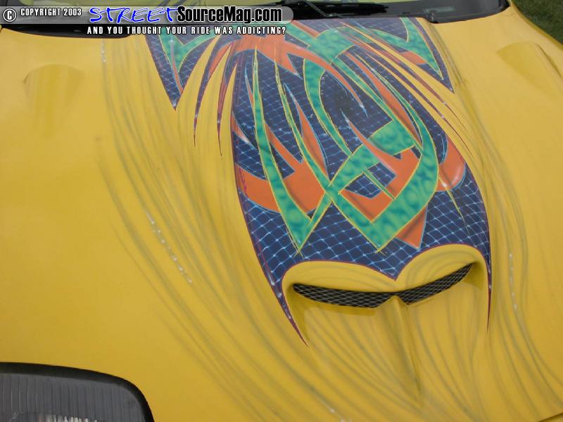 After starting there, Silvey continued to make mods throughout the interior. Again with help of friends and Pat Read, Chris rolled the graphics of the exterior into the custom door panels and dash. He also added the custom air gauges into the pillar of the Sunfire for an even more dramatic effect.