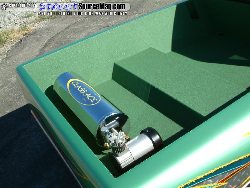 This wasn't low enough for Toms taste, as of yet, so Tom would then perform a 3-½ inch body drop. With the body down to a now much improved level, the rear would receive a set of 2500 lbs Firestone bags along with a set of 2600 lbs Firestone bags up front to help get the body up off the ground. Making sure the bags get the necessary air, four ½ inch Parker electric valves with ½ inch air line would be installed through out. Making room for the 17 inch Alba Reflections wrapped in Eagle Goodyear tires upfront, the battery would need to be relocated in the cab under the speaker box.