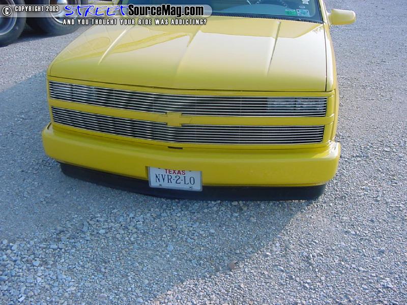 Before the competition yellow was laid down Brian welded up the door handles and antennae hole and ditched the factory taillights in exchange for a set of 98' caddy lights. To add to the exterior Kyle also ditched the factory "elephant ear" mirrors for a set of Street Scene mirrors and added a full phantom billet grill up front.