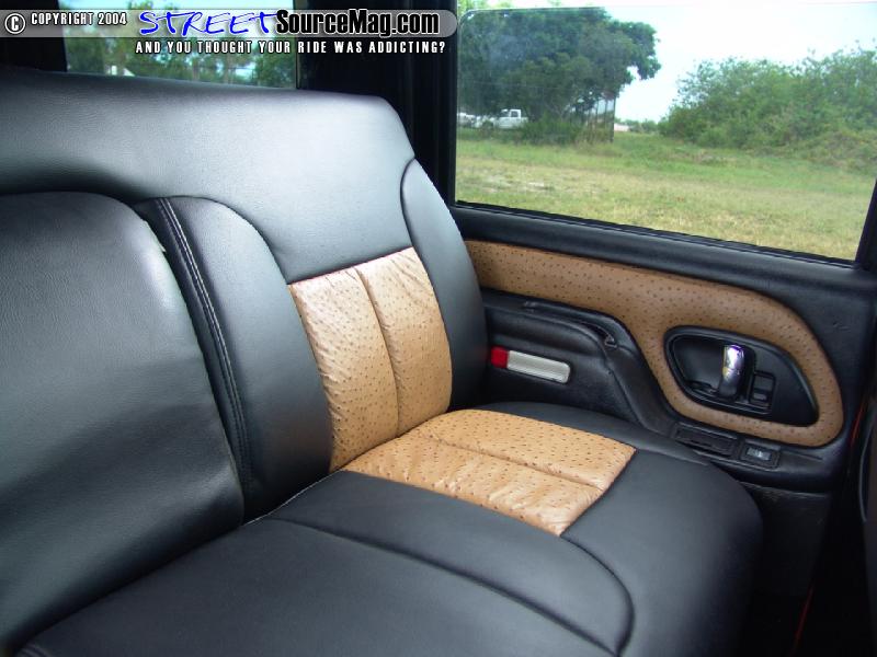The headliner would be wrapped black and all other interior pieces would be smoothed and painted. The seats would then be covered with a Katzkin leather kit with ostrich inserts. Billet specialties vintec steering wheel would help pull everything together.