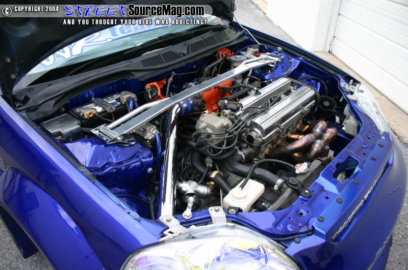 Other modifications to the motor include the Moroso oil pan, polished lightweight pulleys, Equal Length manifold, OBX exhaust, and a 50 shot of nitrous courtesy of NX. The turbo setup is taken care of with a Greddy Turbo Timer.