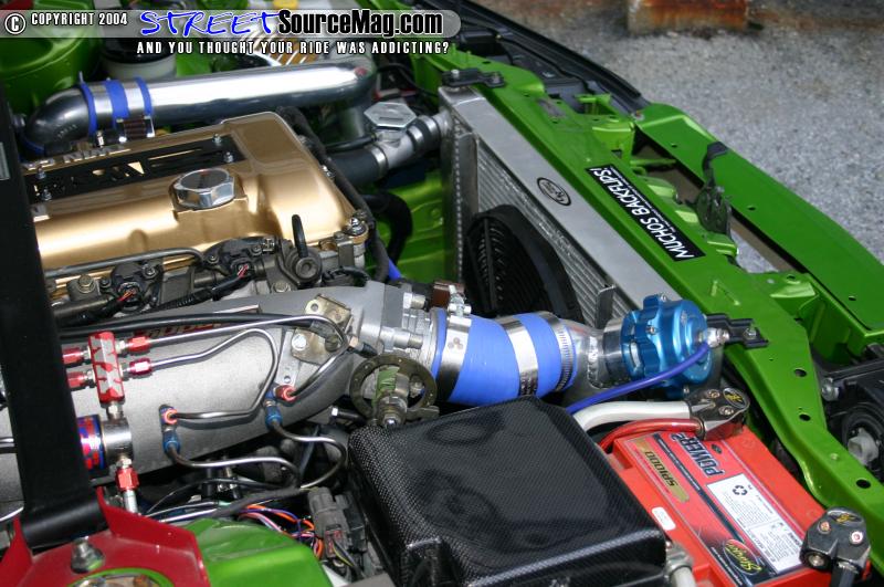 Other dress ups done to the motor include T-Bolt clamps, painted valve cover, E&V silicone tubes, Weld spark plug cover, Carbon Fiber tray and fuse box cover, and Nisomo oil, fuel, and radiator cap. This 240sx pushes 375-wheel hp.
