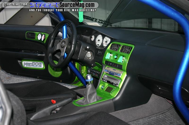 Upon opening the doors a Cusco 6-point roll cage greats you along with the Momo Steering wheel equipped with Tekniq Autosports snap-off system and Momo hub adapter. The interior also houses Nismo S15 floor mats, Sparco racing seats with harnesses, Stewart Warner gauges, Veilside titanium shift knob, Veilside titanium pedals, a custom center console, and a mad carbon shifter boot.