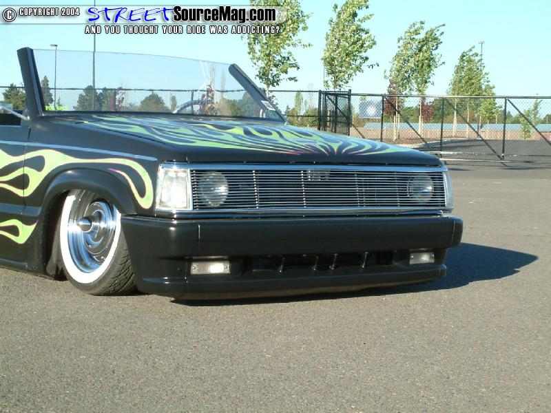 Behind the grille Chris would install a set of 72 GMC truck headlights replacing the stock Mazda headlights. Next Chris would install the stock Mazda bumper with filled plate holes and factory chrome trim. The door handles would then be shaved along with the gas filler door.