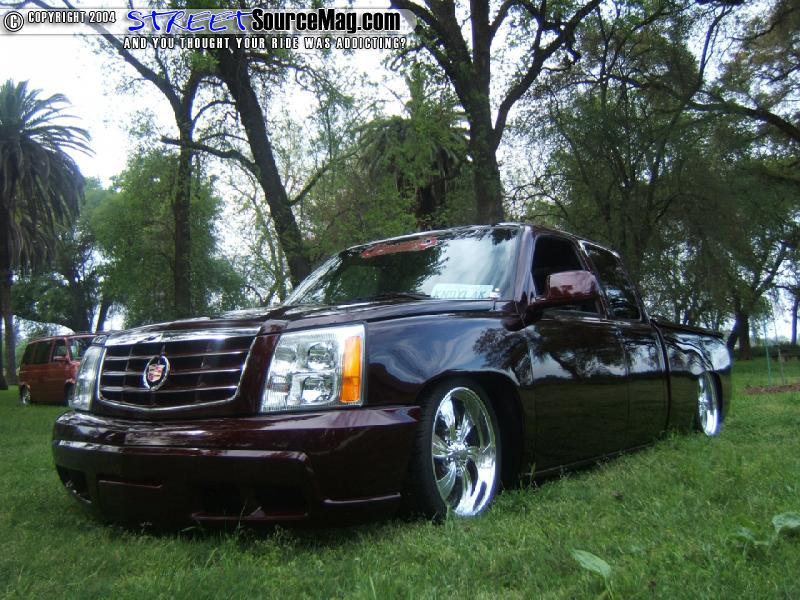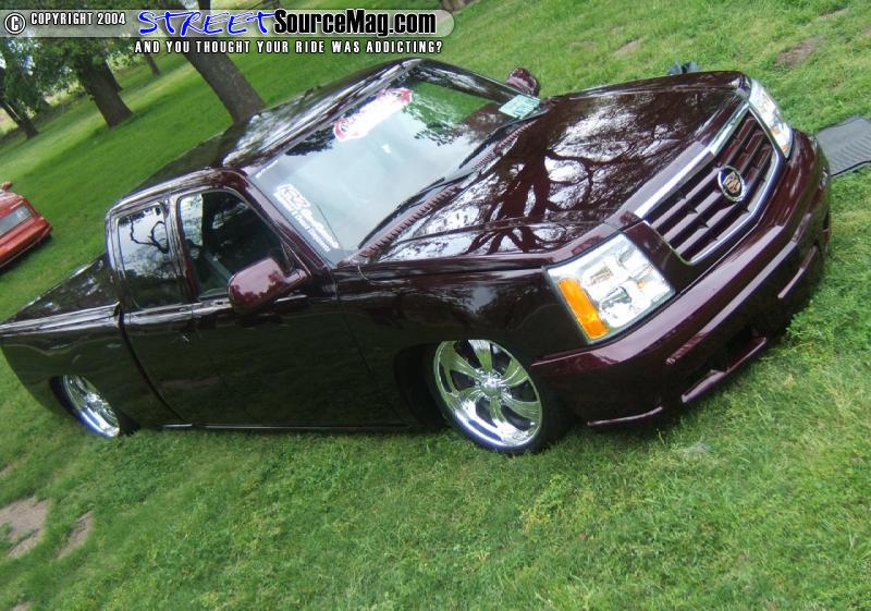 To replace the taillights he upgraded to a set of AVS L.E.D. taillights and molded the license plate box into the area where the tailgate-use to reside. He then converted the nose of the truck to that of a Caddilac Escalade and added a Gaylords Tonneau cover to give the truck it’s sleek look. Next the truck was fully sprayed in a kandy House of Kolor Brandywine.
