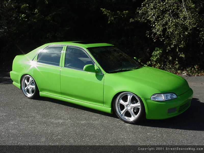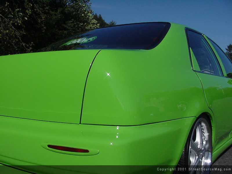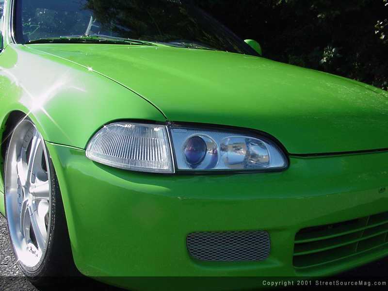 After liking the looks of the smooth hood it was time to apply the same to the under-side of the trunk lid. After shaving the sides, front and back of the Civic, it was time to remove the body seams and add a power sunroof.   Next on the agenda would be to bolt up a Wings West body-kit mixed with a Grill Craft grill and a set of projector headlights along with a stock 2-door coupe front bumper to give the front end a new over all look. Once the bodywork was complete, it was time to lay down the PPG Kawasaki green paint. Friends Tom Jacobs and Jason Haase performed the bodywork, while Matt Brown applied the paint.