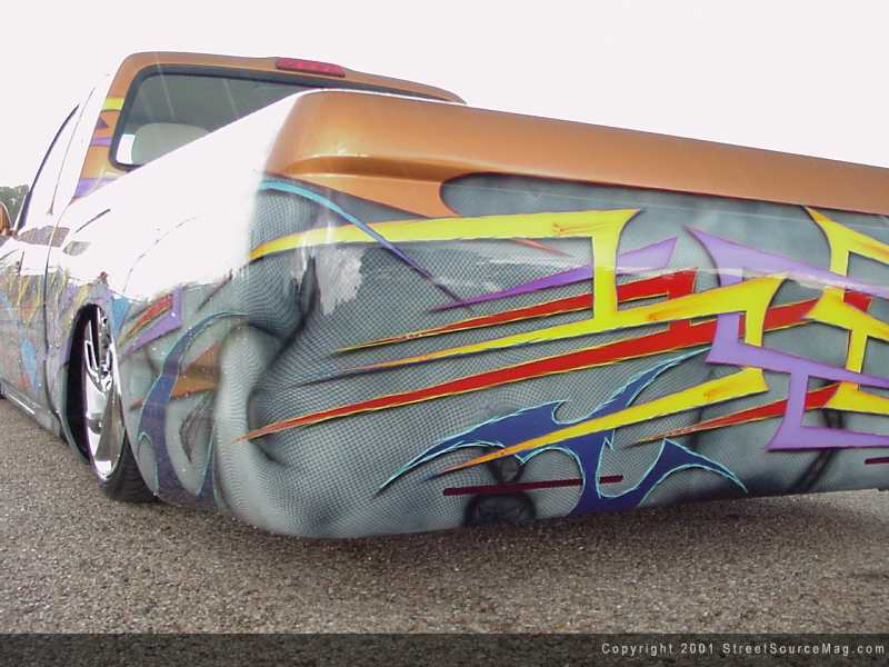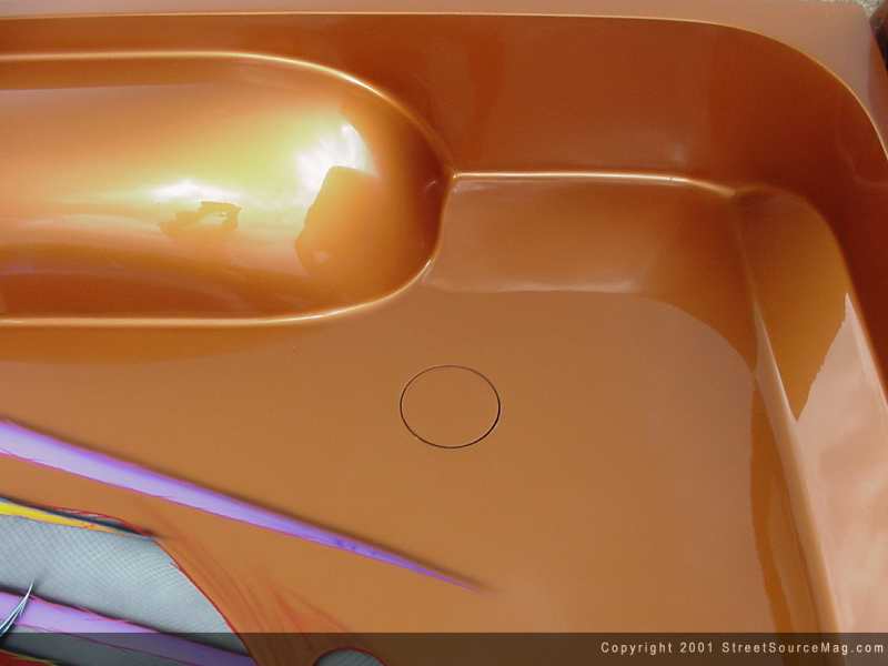 The tailgate was then welded shut, the taillights shaved and replaced with Hagan rod wear tail lights. Next a Sir Micheals roll pan was welded in and the license plate box was molded at an angle in the stock taillight location. At this point the truck was nearly complete on the outside. A PPG Saphron Gold paint was added to finish the outer looks.