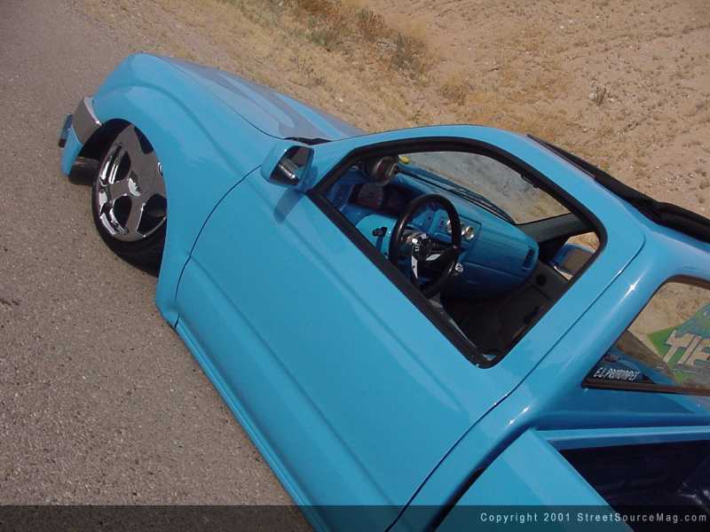 The tailgate was then smoothed out with a skin combo and molded to the bed for an over all smooth look. After many dragging episodes Mike found the Taco back down to Anaheim Prestige Auto body to rework the rear Alter Images skin combo after dragging it along the California roads. The taillights where shaved and a set of Hi Tech LED's, which were designed by Mike, and were flush mounted into the roll pan. Mike performed most of the long list of modifications. Chris and Eurocraft Collision of Middletown, NY, are responsible for the taillights, gas filler door, cab seams and corner lamps.