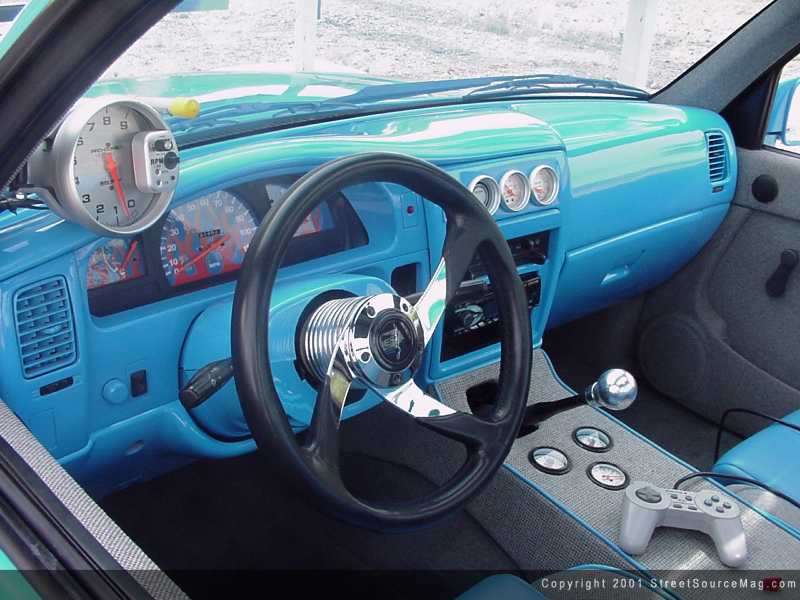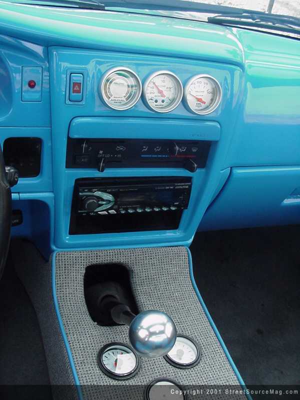 Looking around the interior, you will also notice an Autometer tachometer along with a set of NU image gauges set behind the Grant GT steering wheel. Since Mike can't wait for 4th of July for firework displays, he finds himself driving the Taco from time to time. While driving around one would need tunes, so for he's cruising purpose, an in-dash Alpine flip down CD player would be installed. Bringing the sound forthright, a set of Rockford Fosgate mids and tweets would be installed. Mike himself is responsible for the wiring that was performed.