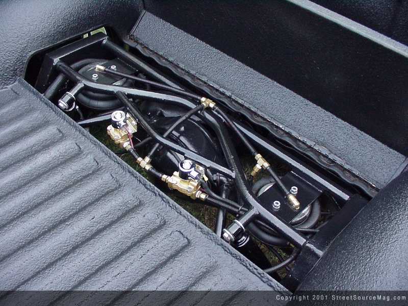 To get the ball rolling on her project truck, Heather contacted Eric Arrington at KUSTOMWERKS in Union City, Tennessee to get her truck down to a driving level that suited her. Eric went to work immediately by notching the rear frame rails five inches and creating a one-off tubular cross member. Next, the factory leaf springs were ditched and in their place Eric installed an Air Ride Technologies parallel 4-link. Eric also installed Firestone 2600 airbags in the rear, along with Doestch Tech gas shocks to smooth the bumps out. Up front, Eric flipped the ball joints and then created custom airbag brackets in order to mount the Firestone 2200 bags. Again Doestch Tech shocks were installed to help keep the ride smooth. While working the front, Heather also had Brembo cross-drilled brake calipers installed. After getting the bags and mounts installed, Eric plumbed the system using ITT electric fast valves with 3/8" airline throughout the system. Two Firestone compressors are used to fill the two 3 gallon powder coated air tanks that supply Heather's truck with the air for the bags.