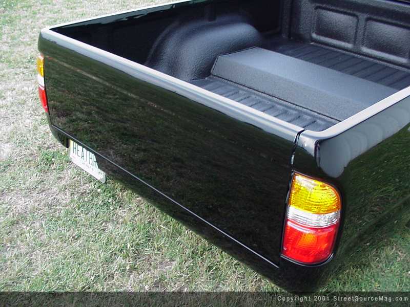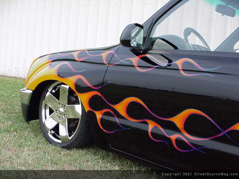 Next, Heather dropped her truck off at Ronnie's Custom Refinishing in Grenada, Mississippi, where Ronnie Boatman finished the body work by shaving the squirters, door handles and tailgate handle.  | The clean set of flames led your eyes to where the handles used to reside. | From there, an Alter Images roll pan was installed to give the rear end a smoother look as well. Finishing off the rear end is a set of taillights from a 2001 Tacoma. Up front, Ronnie installed a chrome 4x4 bumper and valance from a '97 Tacoma and then recessed the headlights to accommodate the Trenz polished phantom grille. Ronnie also installed a set of 2001 rear view mirrors.