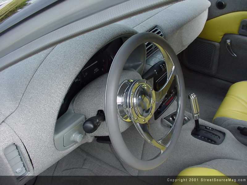 Keeping with the stock seats, Geoff turned to Dan from Custom Covers in Lebanon, TN for his professional assistance. While in Dan's hands, the seats would be wrapped in a two-tone gray tweed and yellow leather pattern. With all of the panels covered one way or another including the new floor material, there would be various billet items customized to fit, found within the interior. A chrome shifter along with a set of race pedals would be added for viewing pleasures.
