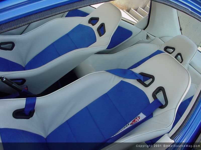 All of the stock seats where subsequently removed and set aside for 2 sets of Corbeau racing seats. Before mounting up the seats, they would be wrapped with white vinyl and blue ultra suede materials.