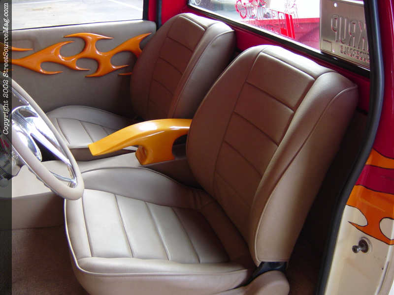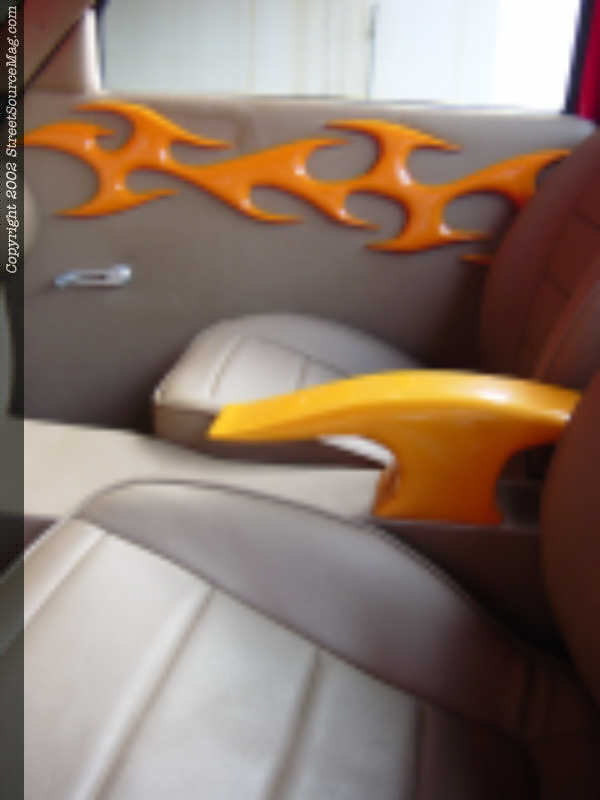 Inside the cab, Les turned to Tracy Swanner and Alan Lightsey for their help flowing the outside paint scheme into the cab. The job was handled with perfection. First, you will find a custom built dash, complete with Dakota digital gauges. Next, the door panels were restitched using walnut leather. The panels even include matching orange flames.  The factory seats where trashed and replaced with '91 Toyota Camry seats, rewrapped in walnut leather as well.