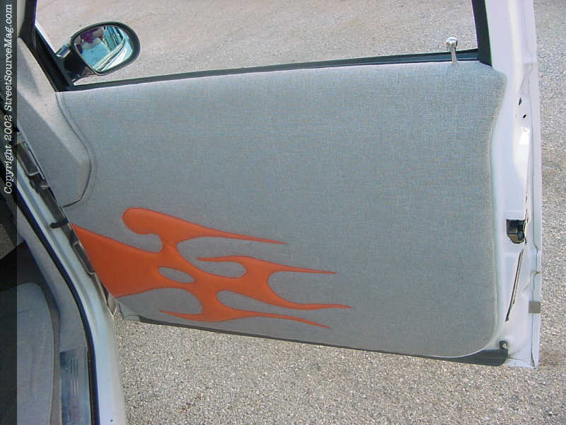 Moving to the interior Allan had Todd Haygood at Upholstery Unlimited in Oklahoma City work his magic. Todd junked the factory seats for a set of Dodge Charger wrapped in gray tweed with orange vinyl flames. With the interior concept already on the seats Todd kept it flowing with the doors and the headliner matching the seats.