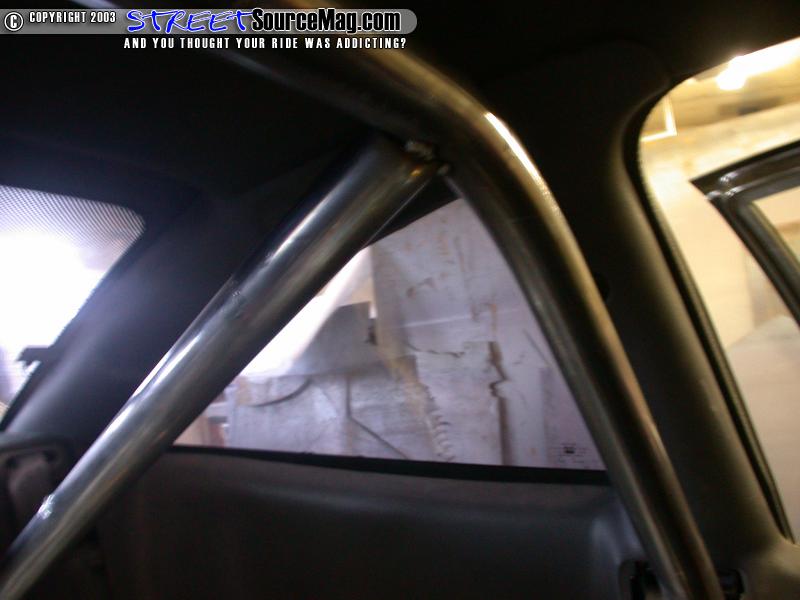 Now we need to test fit the rear braces. We choose to have the rear braces go through the rear deck and mount to the rear of the trunk (for a more rigid body). To do this we had to drill holes in the rear deck gussets for the bars to go thru. We installed plates in the trunk (like the ones before) for the rear braces to attach to. Then we tack welded the rear braces in place.
