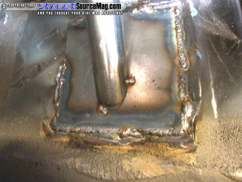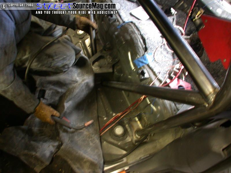 Next comes the seat cross member. After you determine the height at which you will mount it, test fit it in place against the main hoop. It may be a good idea to test fit the frame supports and door braces at the same time. Once that is done, mark where these will be placed and trim as necessary for proper fit. Tack weld the seat cross member in place. Next, we need to install the floor plates for the door braces. We recommend positioning them so they mount on the strongest area of the floor possible. We chose to do it on the lower part of the firewall where the unibody frame rails were. Weld the floor plates in place. The floor plates up front required a lot of grinding to the floor because of a ton of sound deadening/glue type material sprayed over the surface. We removed it so we had a clean metal surface to weld on.